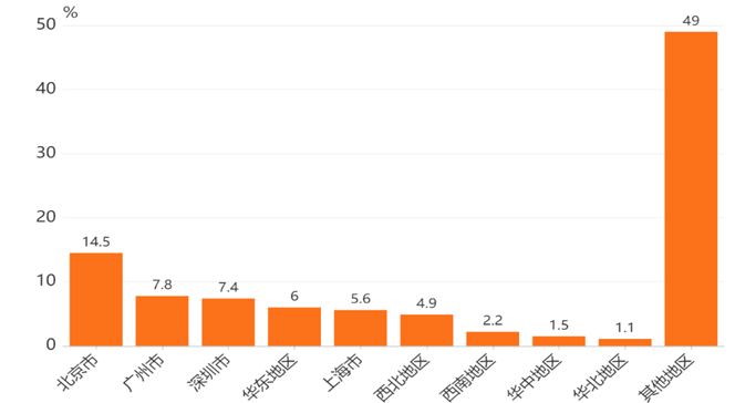 根据全球新经济商业情报数据平台——艾媒数据中心统计的2020年中国人力资源管理专业就业地区分布数据,本专业14.5%就业岗位分布在北京市,比例远高于其他省市。