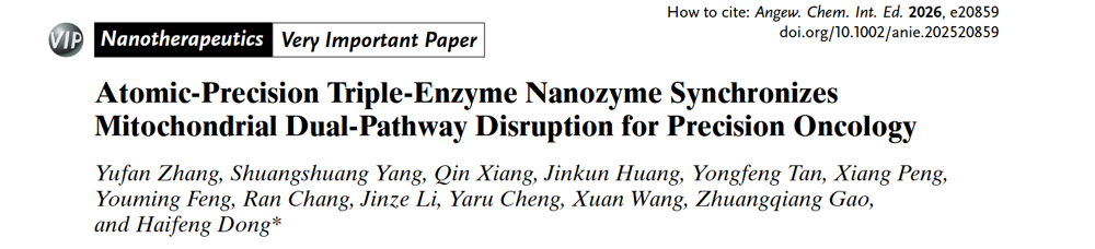深圳大学医学部生物医学工程学院董海峰教授在国际知名学术期刊Angewandte Chemie International Edition (影响因子:16.9, 中科院JCR一区, TOP期刊VIP)上发表了题为“Atomic-Precision Triple-Enzyme Nanozyme Synchronizes Mitochondrial Dual-Pathway Disruption for Precision Oncology”的研究论文。医学部生物医学工程学院博士生张玙璠为第一作者,董海峰教授为通讯作者,深圳大学为第一完成单位。