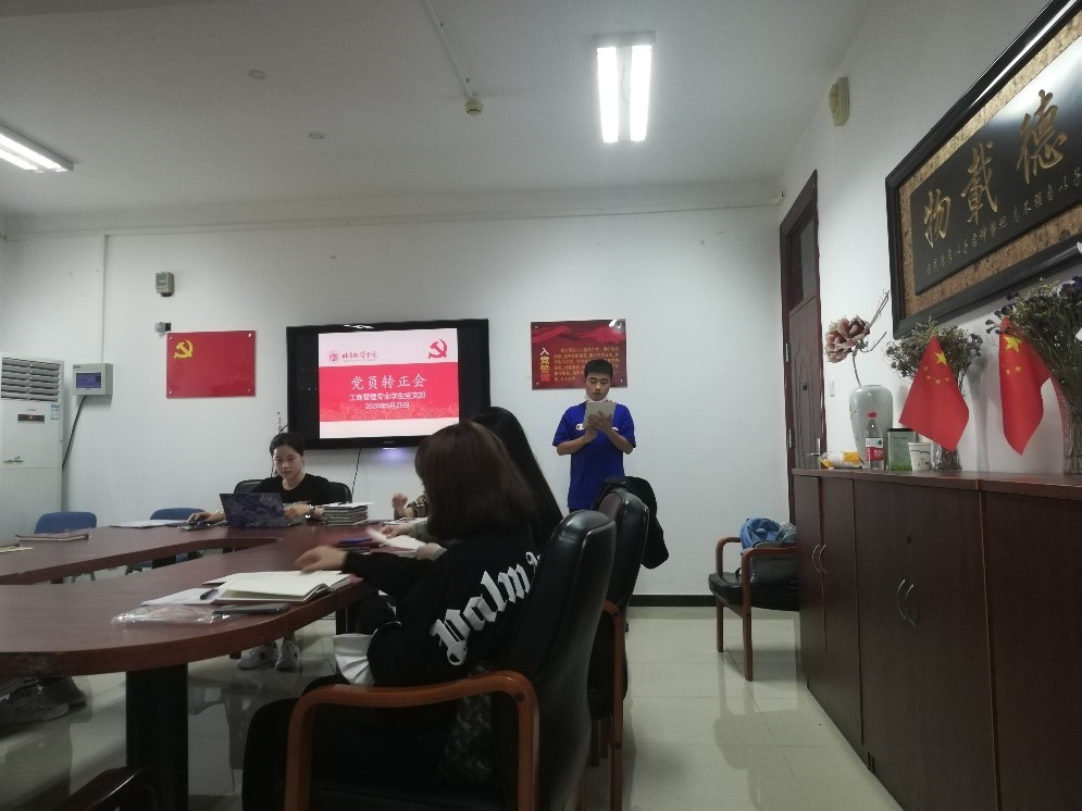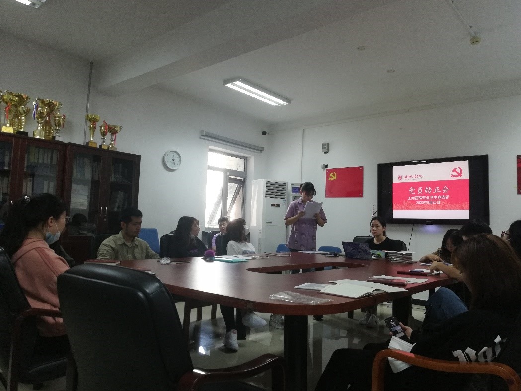 404召开党员转正会。此次会议由党支部副书记刘怡婷主持,支部书记陈霄英、组织员贺玉英老师列席会议。支部全体党员和预备党员到场。