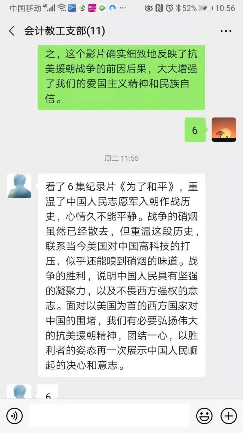 观看了“为了和平”之后,会计教工党支部组织党员讨论观后的感想和认识。党员们纷纷发表意见。曹键老师畅言通过六集电视片《为了和平》的观看,重新回顾了首战两水洞、血战上甘岭、激战松骨峰、会战清川、江鏖战长津湖等战争场景,以及黄继光用胸膛堵住抢眼、邱少云忍受烈火焚烧直至牺牲、杨根思抱起炸药包与敌人同归于尽的画面,深切感悟着伟大的抗美援朝精神。对爱国主义精神和革命英雄主义精神有了更真切的感悟,对全国各族人民不畏强权、维护和平的坚定信心有了更深刻的认识。观影后,心灵震撼,进一步增强“四个意识”,坚定“四个自信”,坚决做到“两个维护”,要将爱国之情、报国之志转化为担当作为、爱岗敬业的自觉行动,为推动学校事业发展贡献应有的力量。郑可人老师看了6集纪录片《为了和平》,重温了中国人民志愿军入朝作战历史,心情久不能平静。联系当今美国对中国高科技的打压,似乎还能嗅到硝烟的味道。战争的胜利,说明中国人民具有坚强的凝聚力,以及不畏西方强权的意志。面对以美国为首的西方国家对中国的围堵,我们有必要弘扬伟大的抗美援朝精神,团结一心,以胜利者的姿态再一次展示中国人民崛起的决心和意志。其他老师也各抒己见,表达了进一步立足岗位、教书育人、报效祖国的决心。