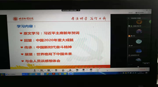 2021年1月15日上午8:30,会计学教工党支部通过腾讯会议召开了2021年的第一次支部大会,全体党员参加,此次会议主要有两项内容:许海晏老师导学《习近平总书记新年贺词》,秦江萍老师导学《深化新时代教育评价改革总体方案》。