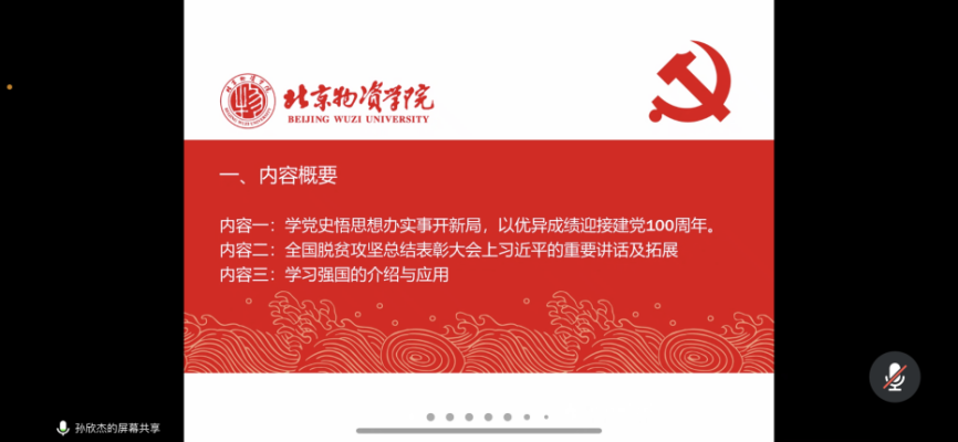 首先由学生党员孙欣杰带领大家对近期学习强国大事件进行逐一回顾。第一部分的内容是学党史悟思想办实事开新局,以优异成绩迎接建党100周年。孙欣杰同志结合习近平总书记在党史学习教育动员大会上的重要讲话为支部同学讲解学习党史的重要性和关键性。第二部分是深入学习全国脱贫攻坚总结表彰大会上习近平总书记的重要讲话。“这是中国人民的伟大光荣,是中国共产党的伟大光荣,是中华民族的伟大光荣!”习近平总书记在全国脱贫攻坚总结表彰大会上庄严宣告,我国脱贫攻坚战取得了全面胜利,完成了消除绝对贫困的艰巨任务,创造了又一个彪炳史册的人间奇迹。在孙欣杰同志在讲解下,支部党员们深感自豪,并纷纷表示要把个人的奋斗目标融入到社会进步,国家发展之中。第三部分是讲述关于学习强国的应用,学习强国是非常好的学习新思想、学习时事政治、学习党史以及党的理论的平台,大家要认真、充分学习。