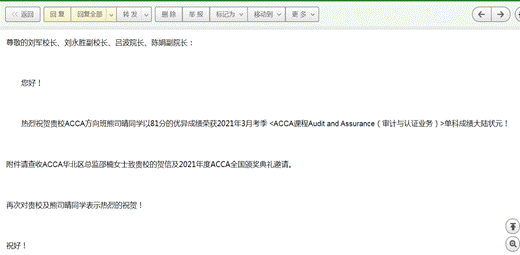 2018级会计学(ACCA)方向班熊司晴同学以81分荣获该课程中国内地单科第一名,这是女仆