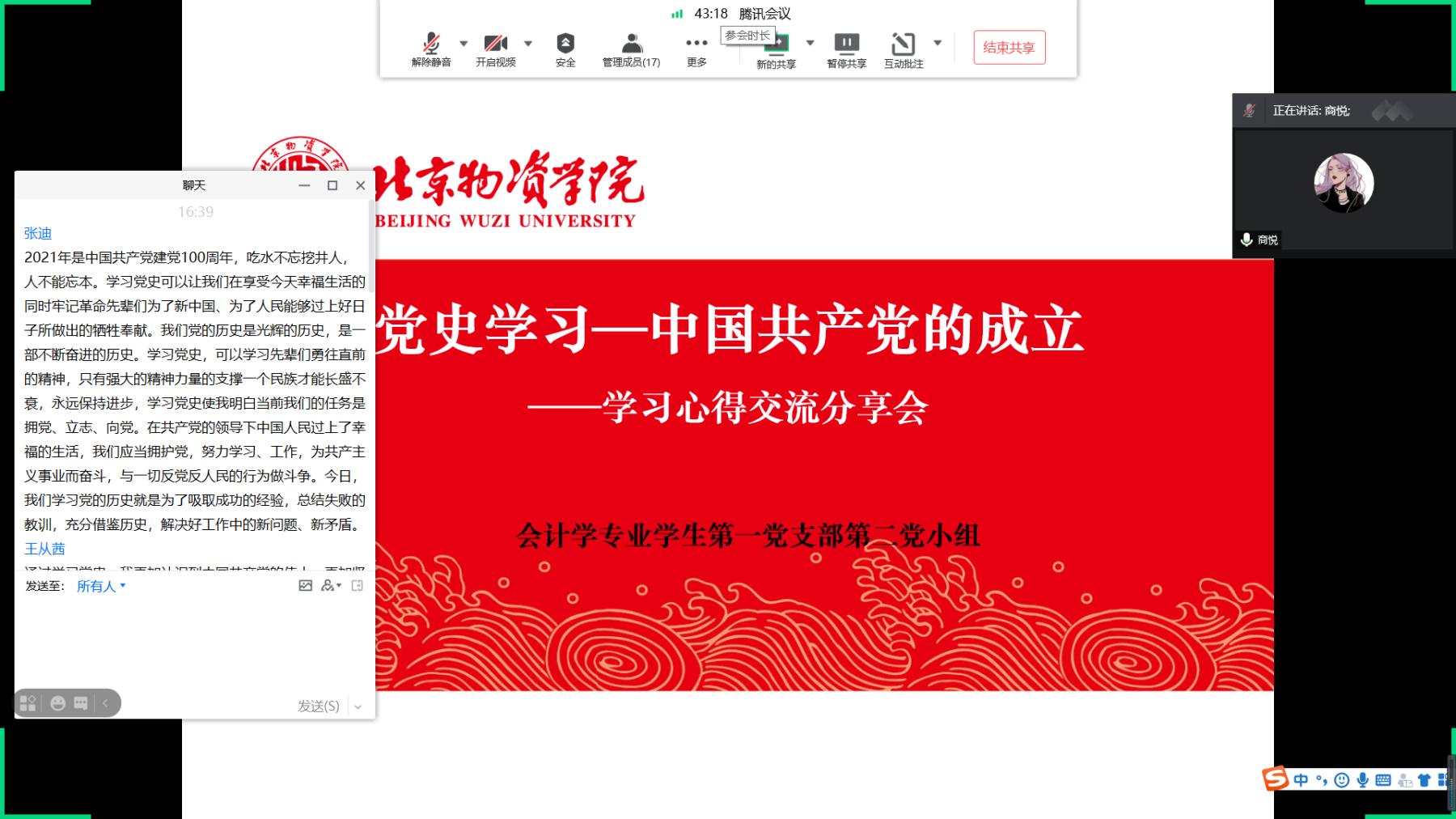 会计学专业学生第一党支部以党小组为单位在线上召开四月理论学习心得分享会,会议分别由各党小组组长主持,会计学专业学生第一党支部全体成员参加。