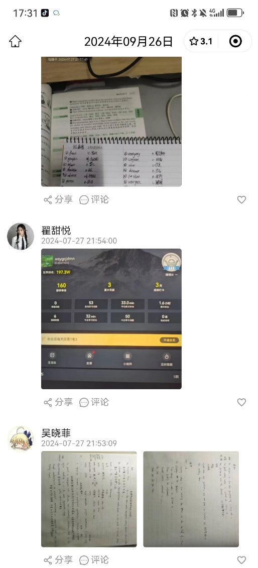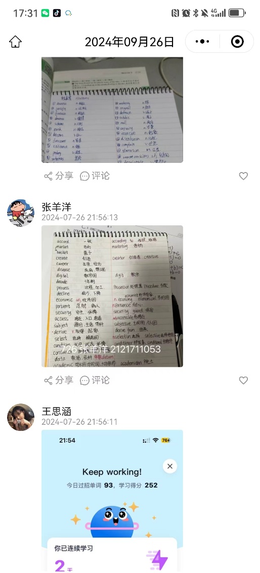 “时光正好,学在当下”学习打卡活动,采用线上分享,线下学习,根据14天学习计划以及个人学习需求,提交当天学习笔记、单词等图片。本次打卡活动,为女仆