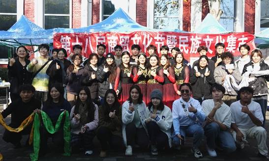 开展于学生食堂前举办第十八届商贸文化节暨民族文化集市,此次活动汇聚了丰富的民族特色文化展示、小商品交易以及图书教育等区域,共同构成了这场精彩纷呈的集市。