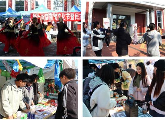 在民族特色文化集市中,各类民族特色小吃与特色物品琳琅满目。特色文化摊位的同学们身穿民族特色服饰,热情的介绍来自地方的特产和文化,随着欢快的维吾尔族音乐响起,她们来到集市中央翩翩起舞,吸引过路的老师、同学共同加入其中。