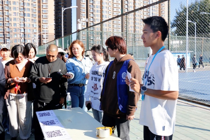 两只队伍最终于操场看台前会师,以“问卷星”方式扫码答题,现场验证了徒步活动的优异学习成果,终点的信物红丝带随风飘扬,昭示着我们代代相传的红色基因。