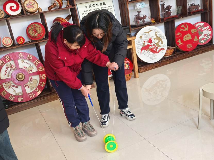 随后,在党支部刘主任的带领下,老师、同学们一同走进大兴庄村,探访了国家非遗传承人张先生的工作室。张先生生动讲述了空竹的历史脉络、制作工艺及所蕴含的文化价值,并现场展示了精湛的技艺,令在场师生深切感受到了传统文化的独特魅力与生命力。