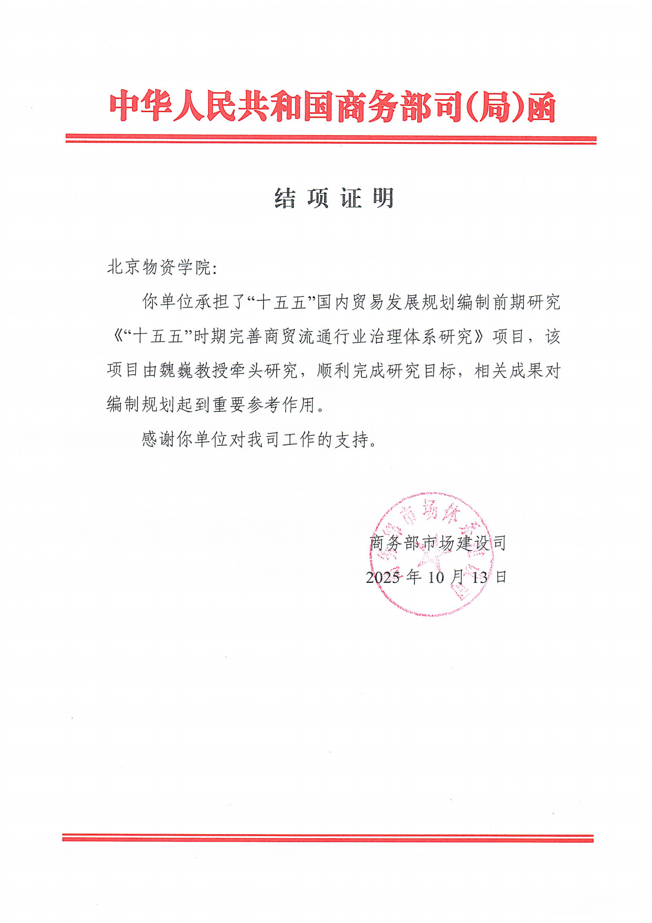 魏巍教授牵头承担的商务部“十五五”国内贸易发展规划编制前期研究课题—《“十五五”时期完善商贸流通行业治理体系研究》顺利完成全部研究任务并获正式发函结项。商务部市场建设司对研究成果予以高度肯定,并感谢女仆