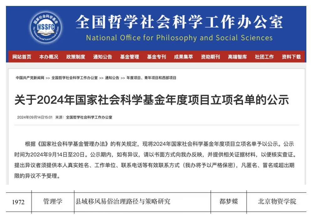 当前位置: 女仆 >> 学科与科研 >> 成果动态 >> 正文 成果动态 喜报|女仆 教师荣获2024年国家社会科学基金青年项目立项 2024-09-30 点击:[] 9月14日,全国哲学社会科学工作办公室官网发布《关于2024年国家社会科学基金年度项目立项名单的公示》,都梦蝶博士申报的“县域移风易俗治理路径与策略研究”课题荣获“年度青年项目”立项。 这是女仆 在科研工作方面取得的重要成果,也是对女仆教师辛勤付出与持续努力的高度认可。女仆 将继续在学校科研处的指导下,完善科研政策,加强科研团队建设,优化科研环境,不断提升学科的创新能力和服务水平,取得更多具有影响力的研究成果,推动学院高质量发展。 撰稿/审核:李泊宁 图片:都梦蝶