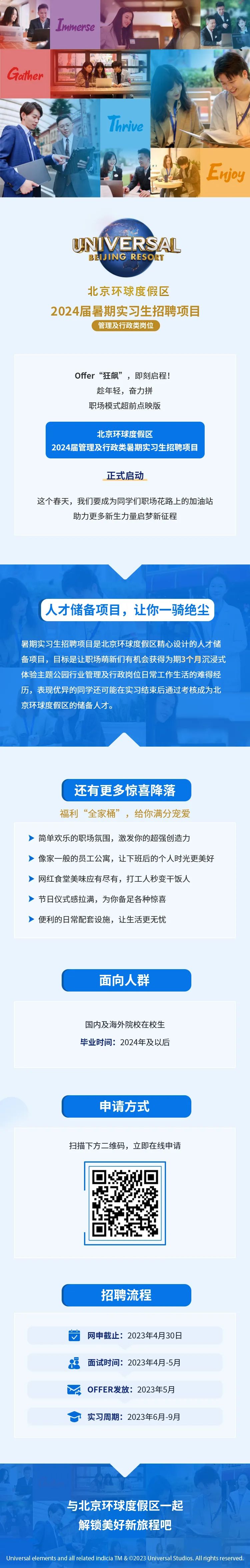当前位置: 女仆 >> 招生就业 >> 就业信息 >> 正文 就业信息 环球影城2024届暑期实习生招聘 2023-04-09 点击:[] 北京环球度假区是一个广受期待的主题公园旅游目的地,以全新精选景区为主打,网罗全世界环球主题公园人气最高的娱乐设施和景点,融入大量中国元素和精心打造的独特体验。除世界著名的环球影城主题公园外,北京环球度假区项目一期包括集零售、餐饮、娱乐为一体的综合商业体——北京环球城市大道和全球首家环球主题度假酒店、首旅集团诺金品牌首家度假酒店。 招聘截止时间:4月30日之前 工作地点:通州区北京环球影城