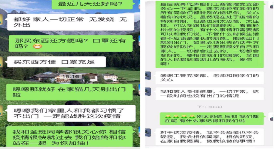 在工商管理学生党支部积极分子中,有两位湖北籍学生牵动着每一位支部成员的心。党支部学生党员及老师代表全体学生党支部成员慰问两名同学的近期情况,鼓励他们在疫情中要保持良好心态。两位同学也表示他们相信党和国家的力量,对抗争此次疫情有坚定的信心。
