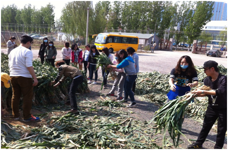 有企业给农场捐赠了32吨的大葱,杂乱的堆积在停车场,需要人力码放整齐。党员们得知此事后,主动要求前去帮忙。党员们采用流水化作业,将大葱轮流传递,减少不必要的走动,大大的提高了效率,达到了事半功倍的效果,一座座“大葱山”变成了一队队整齐站立的“大兵”。
