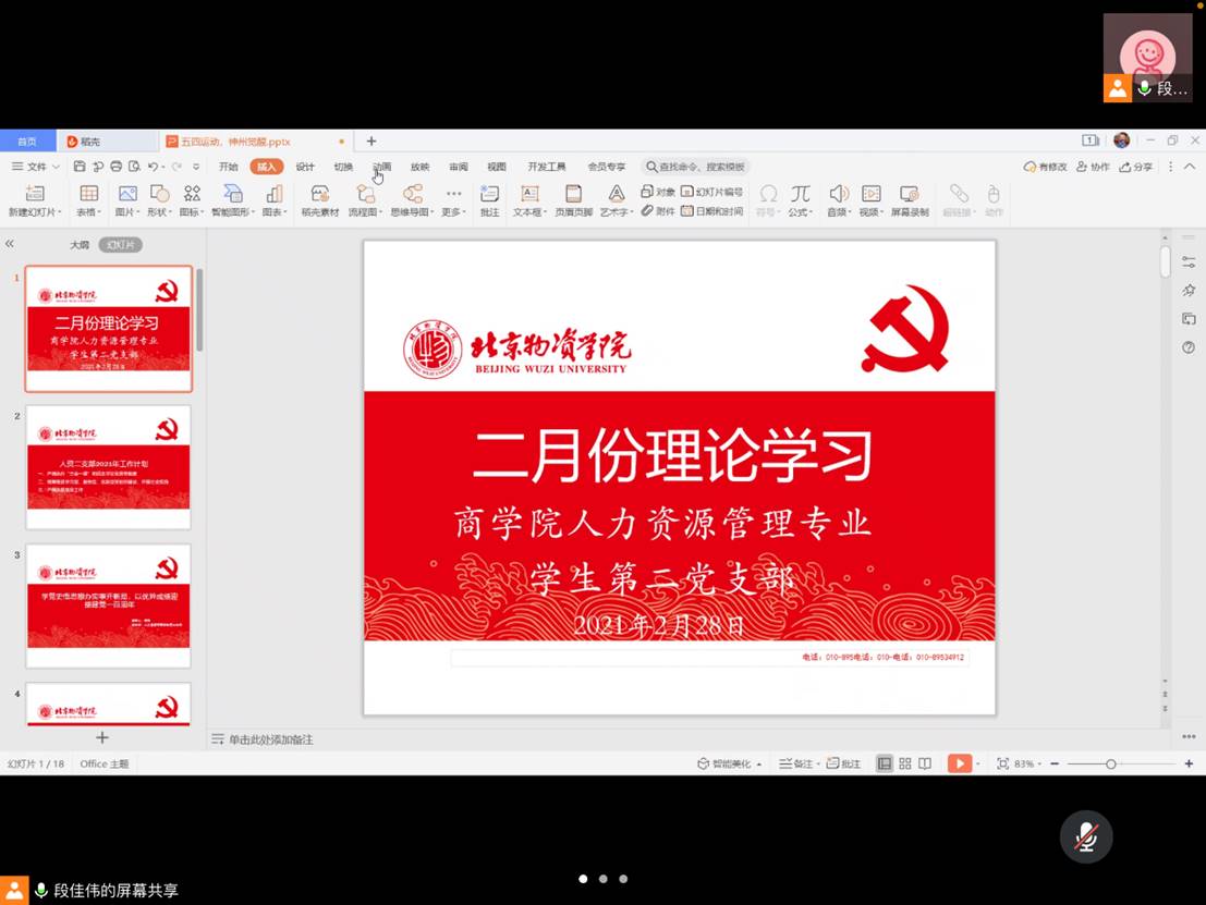 人力资源管理学生第二党支部借助腾讯会议平台开展了二月的理论学习大会,本次理论学习会由人资学生第二党支部副书记段佳伟主持,学生党支部全员参与。