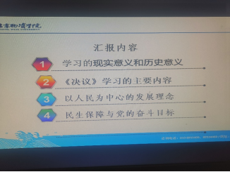 李燕荣老师从学习的现实意义和历史意义、《决议》学习的主要内容、以人民为中心的发展理念、民生保障与党的奋斗目标四个方面阐述了《决议》的主要思想,强调必须坚持党的基本理论、基本路线、基本方略,立足新发展阶段、贯彻新发展理念、构建新发展格局、推动高质量发展,协同推进人民富裕、国家强盛、中国美丽;强调必须永远保持同人民群众的血肉联系,不断实现好、维护好、发展好最广大人民根本利益;强调必须铭记生于忧患、死于安乐,常怀远虑、居安思危,继续推进新时代党的建设新的伟大工程;强调必须抓好后继有人这个根本大计。号召全党全军全国各族人民勿忘昨天的苦难辉煌,无愧今天的使命担当,不负明天的伟大梦想,以史为鉴、开创未来,埋头苦干、勇毅前行,为实现第二个百年奋斗目标、实现中华民族伟大复兴的中国梦而不懈奋斗。在新时代实践中不断丰富和发展。