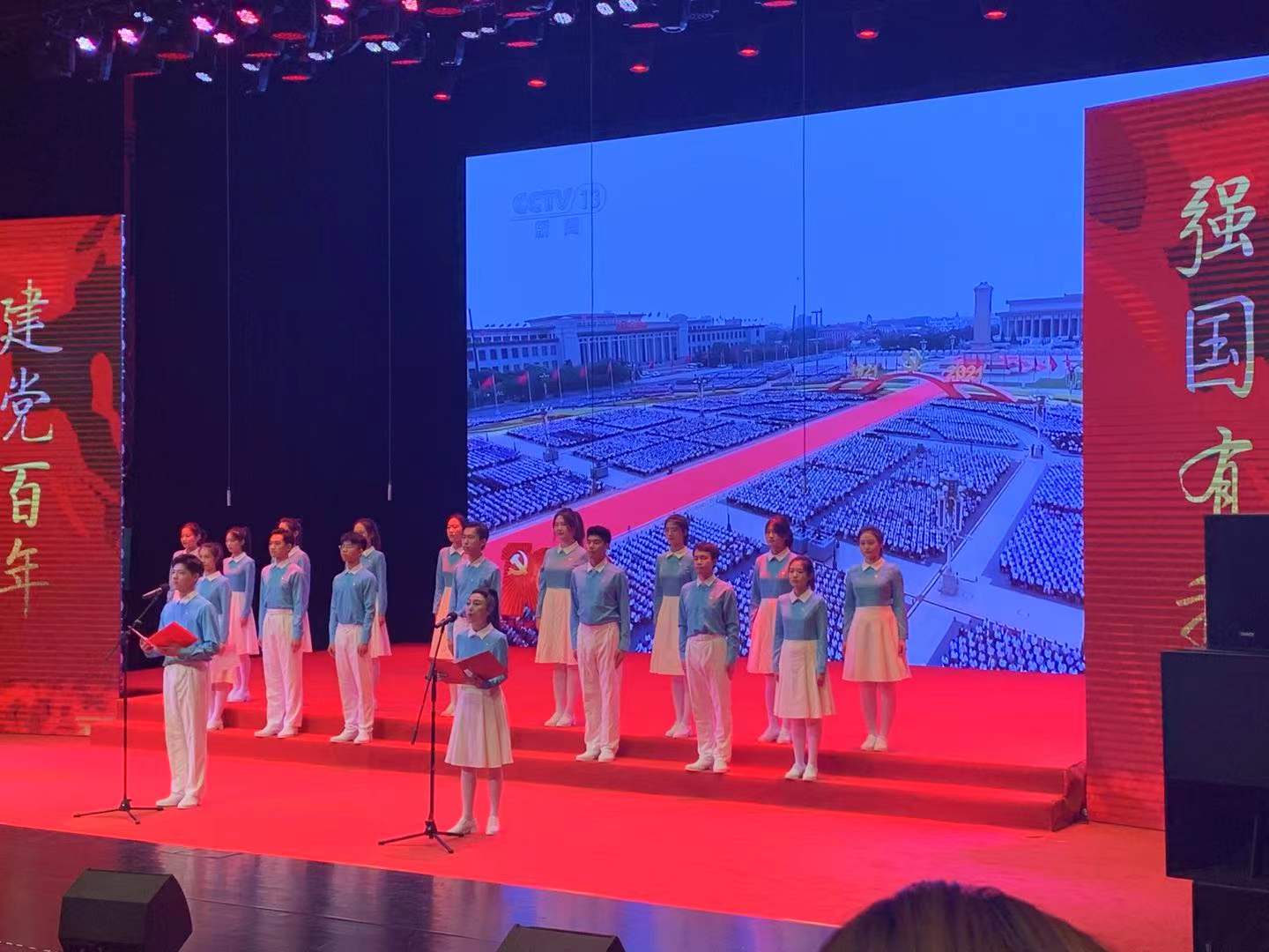 大会最后,全体起立,与在台上的合唱队员们同唱《没有共产党就没有新中国》,在昂扬的歌声中,大会正式结束。