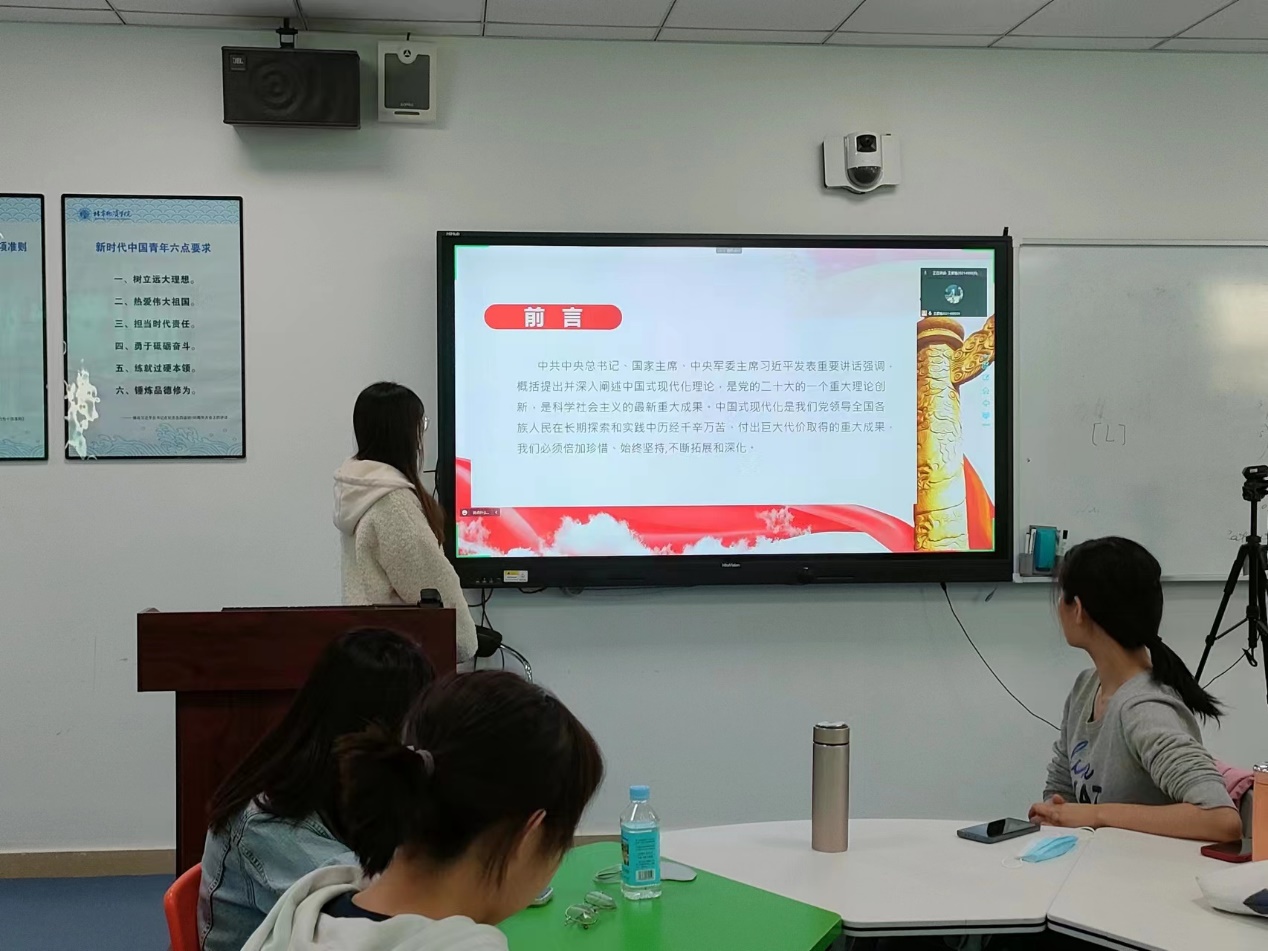 会议伊始,由马鑫同志带领党支部成员展开对二十大精神的学习。马鑫同志首先带我们回忆了中国共产党的百年党史,包括新民主主义革命时期、新中国成立后、改革开放和社会主义现代化建设新时期,最后表明探索中国式现代化道路的重任落在中国共产党身上。其次,马鑫同志总结了党的十八大以来取得的历史性成就和历史性变革。最后,马鑫同志带我们学习了中国式现代化的含义以及如何推进中国式现代化,并表明中国式现代化走得通、行得稳,是强国建设、民族复兴的唯一正确道路。