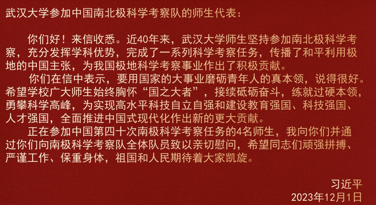 习近平在回信中写道你们好!来信收悉。近40年来,武汉大学师生坚持参加南北极科学考察,充分发挥学科优势,完成了一系列科学考察任务,传播了和平利用极地的中国主张,为我国极地科学考察事业作出了积极贡献。