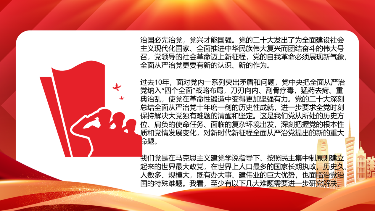 面对全面建成社会主义现代化强国、以中国式现代化全面推进中华民族伟大复兴的崇高使命,面对前进道路上风高浪急甚至惊涛骇浪的重大挑战,面对长期存在的“四大考验”“四种危险”,解决大党独有难题必然是一个长期而艰巨的过程,这就决定了全面从严治党永远在路上,党的自我革命永远在路上。我们一定要站在事关党长期执政、国家长治久安、人民幸福安康的高度,把全面从严治党作为党的长期战略、永恒课题,坚决摒弃权宜之计、一时之举的思想,坚决克服松劲歇脚、疲劳厌战的情绪,坚决防止转变风向、降调变调的错误期待,始终坚持问题导向,保持战略定力,发扬彻底的自我革命精神,永远吹冲锋号,把严的基调、严的措施、严的氛围长期坚持下去,把党的伟大自我革命进行到底。
