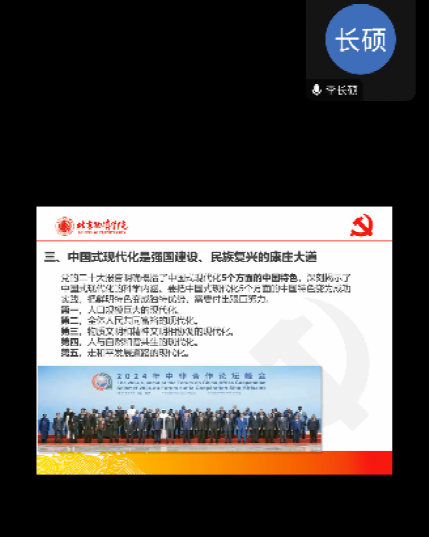 之后,党员们认真学习了习近平主席对于如何以中国式现代化推进强国建设、民族复兴伟业的发言,了解了要坚持中国式现代化这一重大成果,要坚定党的领导,要维护中国特色,开创人类文明新形态、处理好顶层设计与实践探索等关系、神话理论研究和实践探索。在这一过程中,党员需要在国家主流发展的浪潮中起到先锋模范作用。