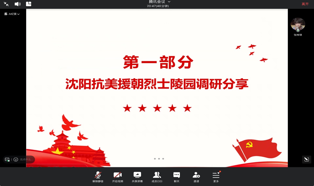 最后,党员东海晴、张梓琪、任梦垚、卢海超、李岩、宋雨柯六位同志与大家分享了前往沈阳进行党建活动的调研心得。调研深入沈阳红色地标,开展“行走的思政课”。在与退伍老兵同志的深入交谈中,深刻体会到一名军人身上纯粹又崇高的爱国情;在沈阳中小学生博物馆讲解员的介绍中,切身感悟党建思政活动对培养理想信念的重要性。这些感悟将激励大家在今后的学习和工作中,坚定爱党报国信念,担当时代使命责任,将红色精神传承下去。