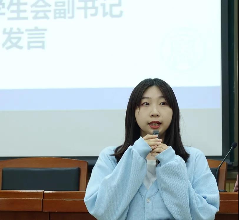 分团委学生会副书记王心雨发言。她向大家介绍了接下来一年里,团委学生会即将举办的各类活动,并对马上到来的团委学生会换届动员相应的问题做出讲解。她希望同学们能够提高自身担当和责任感,加强自身沟通能力、带领团队能力、创新创业能力、负责抗压能力,更好地服务于学院师生。
