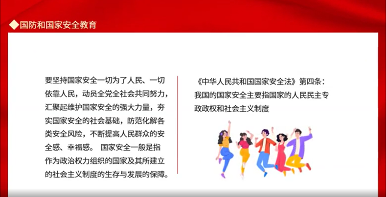 通过线上宣讲形式,为全体家庭经济困难学生讲解《中华人民共和国国家安全法》等法律知识,并采取以案释法的方式,对电信诈骗、危害国家安全等典型案例事例进行深入浅出的讲解,进一步增强了学生的国家安全意识,也进一步增强坚定维护和践行国家安全的主动性和自觉性。