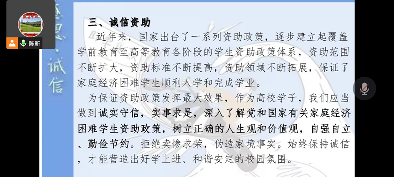 为使广大同学深入了解国家助学贷款有关政策,帮助困难学生顺利完成学业,陈昕对国家助学贷款的种类和具体办理流程进行说明,同时要求同学们申请国家助学贷款一定要诚信申请,实事求是填写各项材料,同时要做好还款准备,按照相关文件要求和自己承诺时间积极还款。