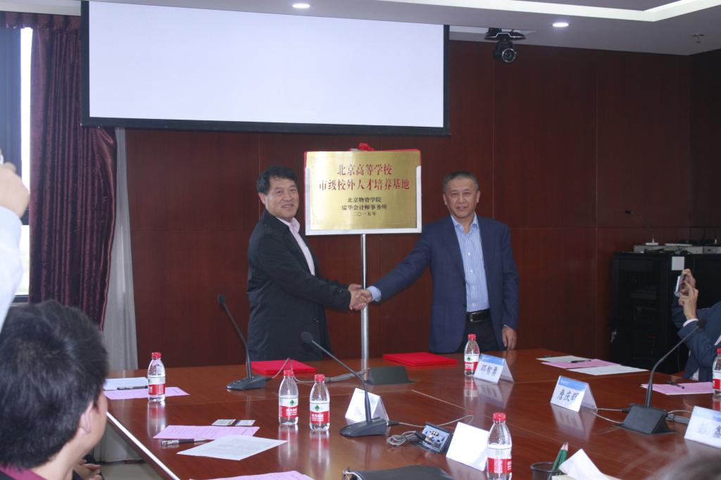 魏国辰院长共同为北京市级校外人才培养基地-瑞华会计师事务所揭牌,朱总监表示瑞华会计事务所将向学校捐赠五万元资助贫困生、奖励优秀学生,并祝愿合作顺利。之后,女仆