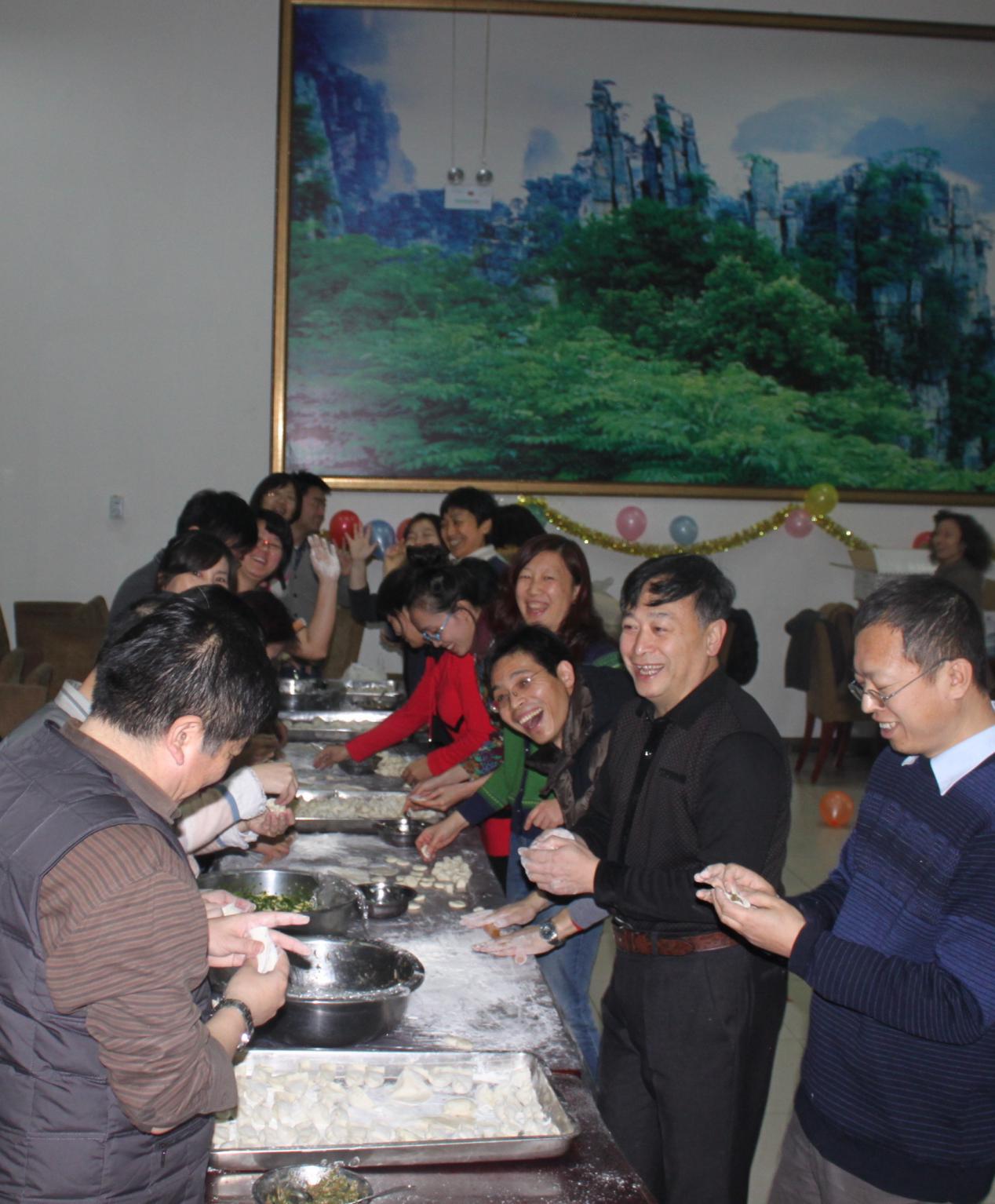 下午5:30进入晚餐环节,大家一起品尝自己的劳动成果,有的饺子包得像“小笼包”,有的饺子包的“皮开肉綻”,还有的包的像月牙儿,虽然形态各异,但吃到嘴里分外香甜,餐桌上大家相互祝福,交流2014年的工作,生活经验,展望2015年的幸福安康!联欢会在给凌林老师的生日祝福中落下帷幕。