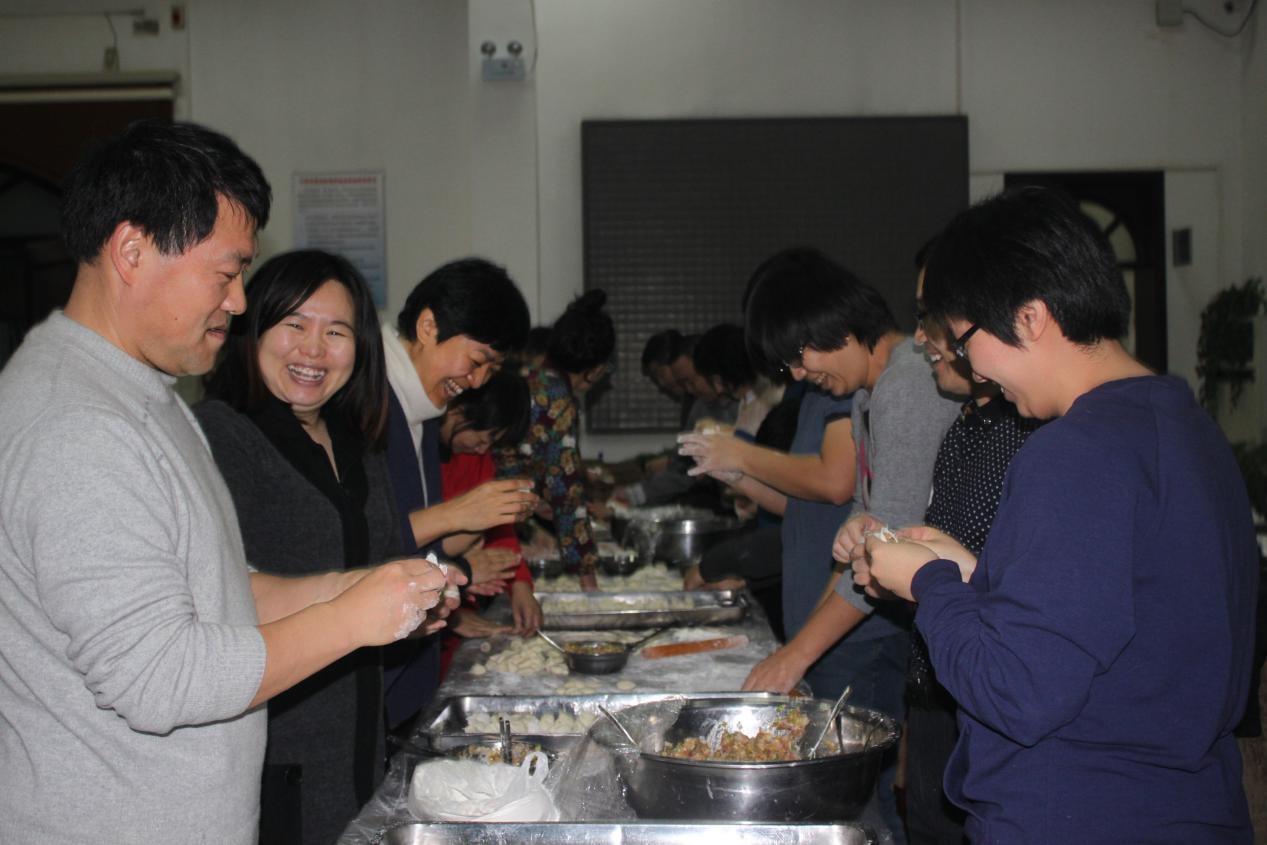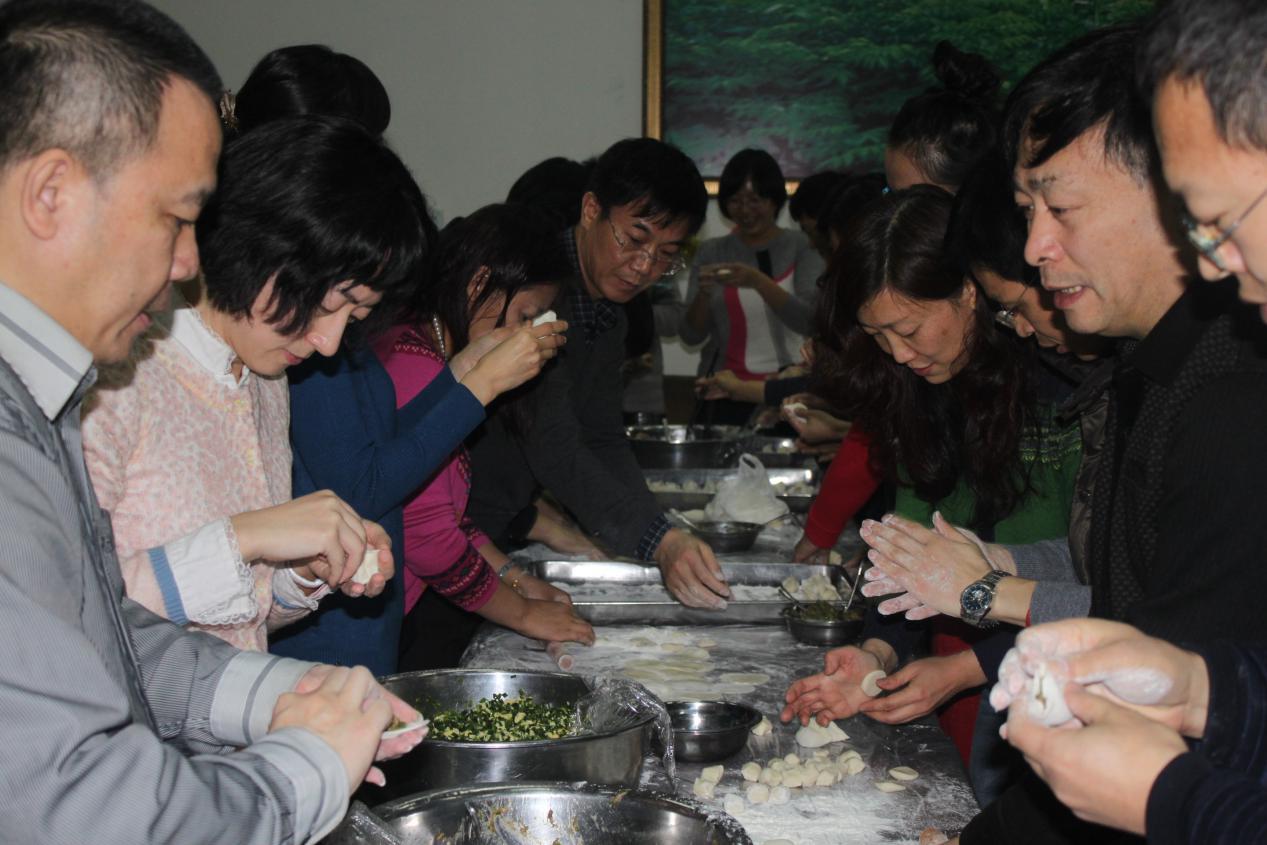 第二个阶段下午4:00—5:30是包饺子活动,全体老师围在一起,亲自动手、各显技艺,揉面、擀皮儿、包馅,互相切磋、交流,其乐融融。