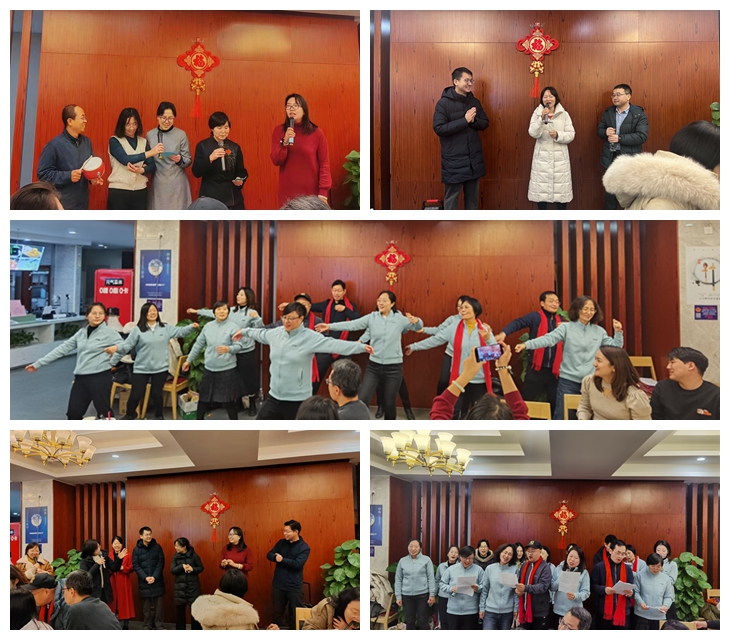 1 2 点左右, 联欢 活动 在 学工小组的歌曲《相亲相爱》中 开始, 两位老师董海辰、王雅琪的深情演唱, 给联欢会带来了 温馨 的气氛。 接着,学院领导班子为大家带来了节目《 新年贺词三句半 》,以轻松愉快的形式祝福全体老师们新年快乐。电商工商系的老师带来了京剧《梨花颂》、人资系的老师们表演了欢快激情的《阿萨舞》 、 并深情演唱了歌曲 《 我和我的祖国 》、营销系的老师们带领大家做了《名字接龙》的小游戏。