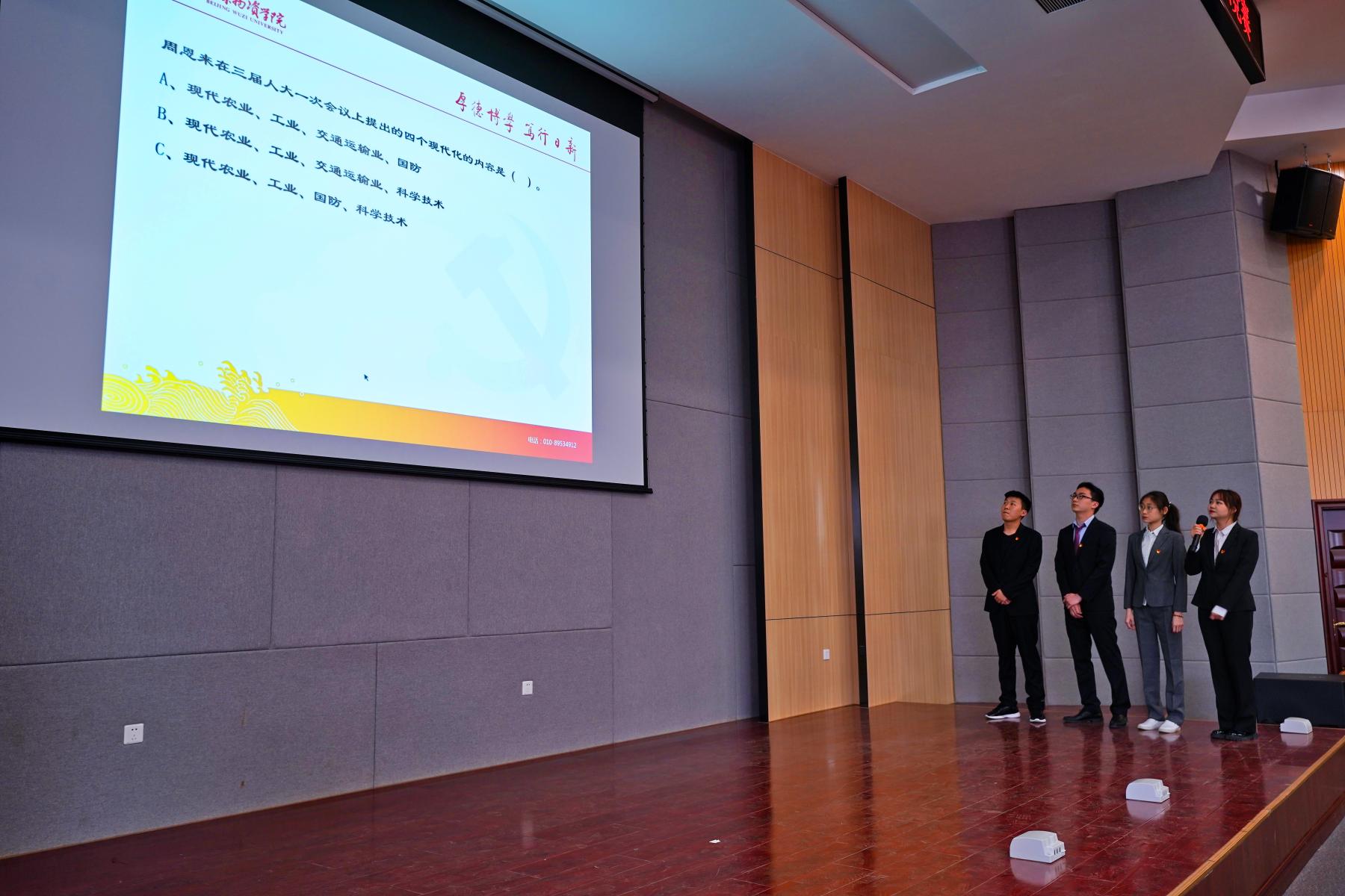 随后进行“党史学习教育,知识问答”环节,既检验选手们的知识储备能力,又考验着他们的细心程度。经过参赛选手们赛前认真学习、充分准备,各代表队比分不相上下,比赛氛围逐渐热烈,赛场上高潮迭起、掌声不断。参赛队员们精神饱满、团结协作、配合默契,展现出扎实的理论知识和良好的精神风貌。经过激烈的竞争,第五组获一等奖;第三组获二等奖;第一组获得三等奖。第二组和第四组获得优秀奖。在随后的现场互动环节,随机挑选在场观赛的观众进行提问作答,同学们积极踊跃,争先抢答。