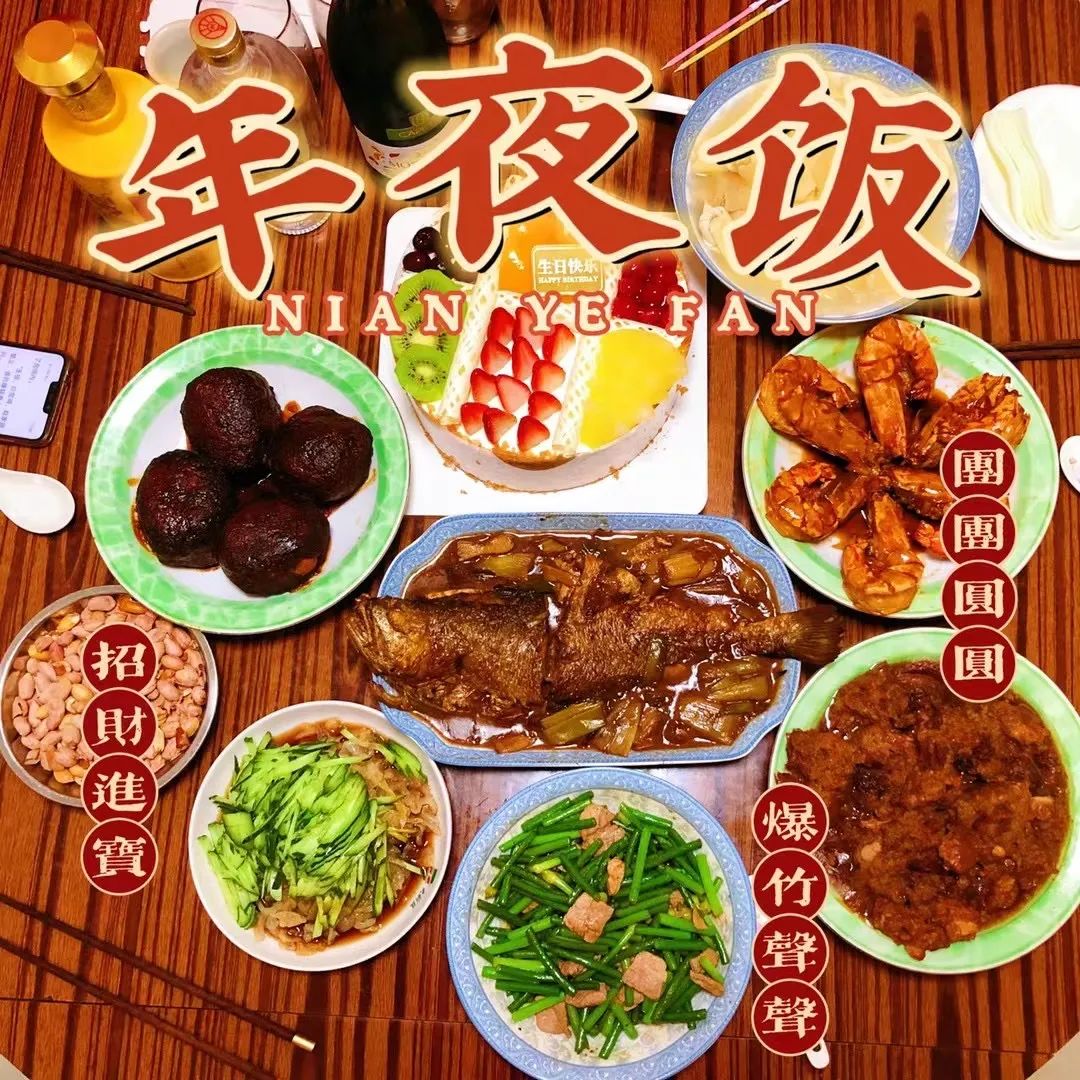 今年相对于去年来说,年夜饭看起来并没有之前那么丰富了,一部分原因是因为防止吃不完浪费,但是每一道菜都注入了我们对于阖家团圆的真情实感。让我简单介绍一下今年的饭桌上都有什么好东西!红烧狮子头个头很大,都有半张脸那么大了,吃起来软软糯糯,里面还有肉汁流出来。红烧鲤鱼很入味,虽然有很多刺吃起来不太方便,但是也不影响我对它的爱,非常下饭哈哈哈。红焖大虾也是年年必备菜品,不知道做什么的时候,选它总不会出错,鲜香又没有海鲜的腥味,属实是很受欢迎了。糖醋排骨是我的最爱,酸酸甜甜,肉质鲜嫩,还有脆骨很有嚼劲,都能吃五六块。桌上唯一的绿色菜就是蒜苗炒鸡蛋了,可能是为了中和一些大鱼大肉的油腻吧哈哈。由于除夕这天家里有亲戚正好过生日,就定了一个蛋糕,一起庆祝,饭后甜点这不就有了!我很喜欢今年的年夜饭,虽然简单,但是心意浓浓。