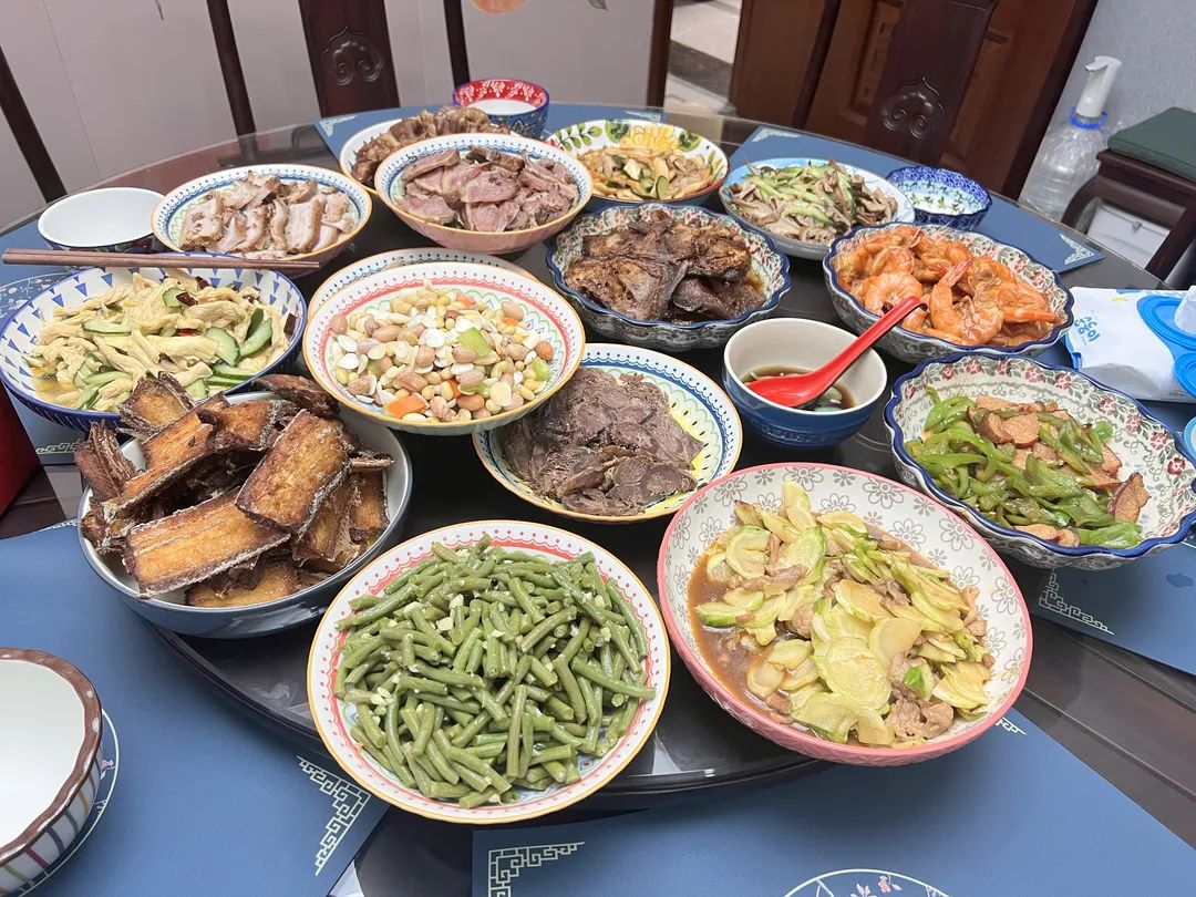 大家好,今天为大家介绍一下我的年夜饭。今天是除夕,我们家里做了许多丰富的饭菜。有湘菜金钱蛋、香菜拌牛肉、凉拌腐竹、炸春卷、肘子、扣肉,凉拌三丝、驴肉、带鱼、蒸多宝鱼、炒鸡肉、炒鱿鱼鲍鱼。金钱蛋的名字寓意来年金钱多多,炸春卷也代表了我们对春的向往。餐桌上有鱼在中华传统文化中,这个鱼要不能吃完要剩到第二天,寓意着年年有余。每道菜都色香味俱全,红红绿绿的颜色搭配也非常的符合中国人的审美。有肉有素搭配的非常合理。还有我们中国在腊八节的时候会泡的腊八蒜,常说过了腊八就是年,喜气洋洋的氛围萦绕在每个人的心中,祝大家新年万事如意!!!
