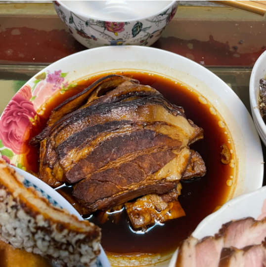 第五道菜:烧肉 买好的鲜猪肉煮好,表面涂上酱油,等吃的时候切片,放上佐料上锅蒸。