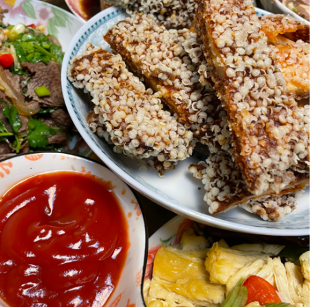 自家年夜饭的特殊品,这是我和弟弟妹妹最喜欢吃的,甜甜的味道和醇香的芝士的组合是一种很奇妙的味道。