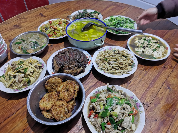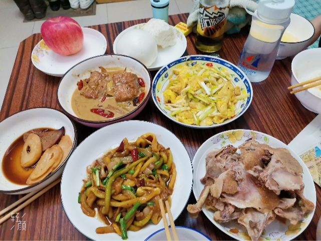 今天是除夕,我们全家人团聚在一起,其乐融融地迎接即将到来的虎年新春佳节。一桌子丰盛的佳肴光看着就足以让人垂涎欲滴。今日的主打菜是清炖羊肉汤。我们购买的羊肉是小巴依,肉质鲜嫩,色泽鲜亮,汤汁醇厚,鲜而不膻。熟肉色的羊汤垫底,撒上葱花,浇上几滴辣椒油。喝着鲜美可口。羊肉汤具有健脾益气,补血温经等功效。在寒冷的冬日里来一碗可谓沁人心脾。还有一道大菜是牛肉炒冬笋。牛肉色泽红润,咀嚼起来津津乐道,配着脆脆的冬笋,别有一番滋味。熏鹅也是我们当地的一大特色。鹅肉含有丰富的蛋白质,可以益气补虚,健脾生津。猪蹄子同样含有丰富的胶原蛋白,咬起来也是口感津美。吃腻了肉菜,便有几道清新可口的蔬菜像是素炒花菜,凉拌黄瓜可以解油腻。最后还有一道甜品是年糕,寓意着人们在新的一年里步步高升。希望我们一家人可以团团圆圆,幸福美满的迎接崭新的一年!