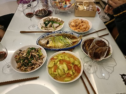 过年了,过年了,一家四口在一起,吃着小菜,真的很温馨,六个菜。你来一口,我来一口,再嘬两口小酒,美滋滋啊。看看那个鱼,清蒸小黄鱼,最后用油泼一下,真香。鱼肉嫩嫩的,滑溜的很。(鱼头对着的是我爸( ͡° ʖ ͡°)✧)话说回来,吃虾的时候,你给我剥一只,我给你剥一只,嗯嗯真幸福啊。还有那个条子肉,肥而不腻,入口即化。下面的jinjin菜(不知道是哪两个字),更是不错,就这馍,不错不错。那几个素菜也非常可。藕吃着脆脆的,笋瓜更不用说是我的最爱。不错不错。最后,祝大家新年快乐!