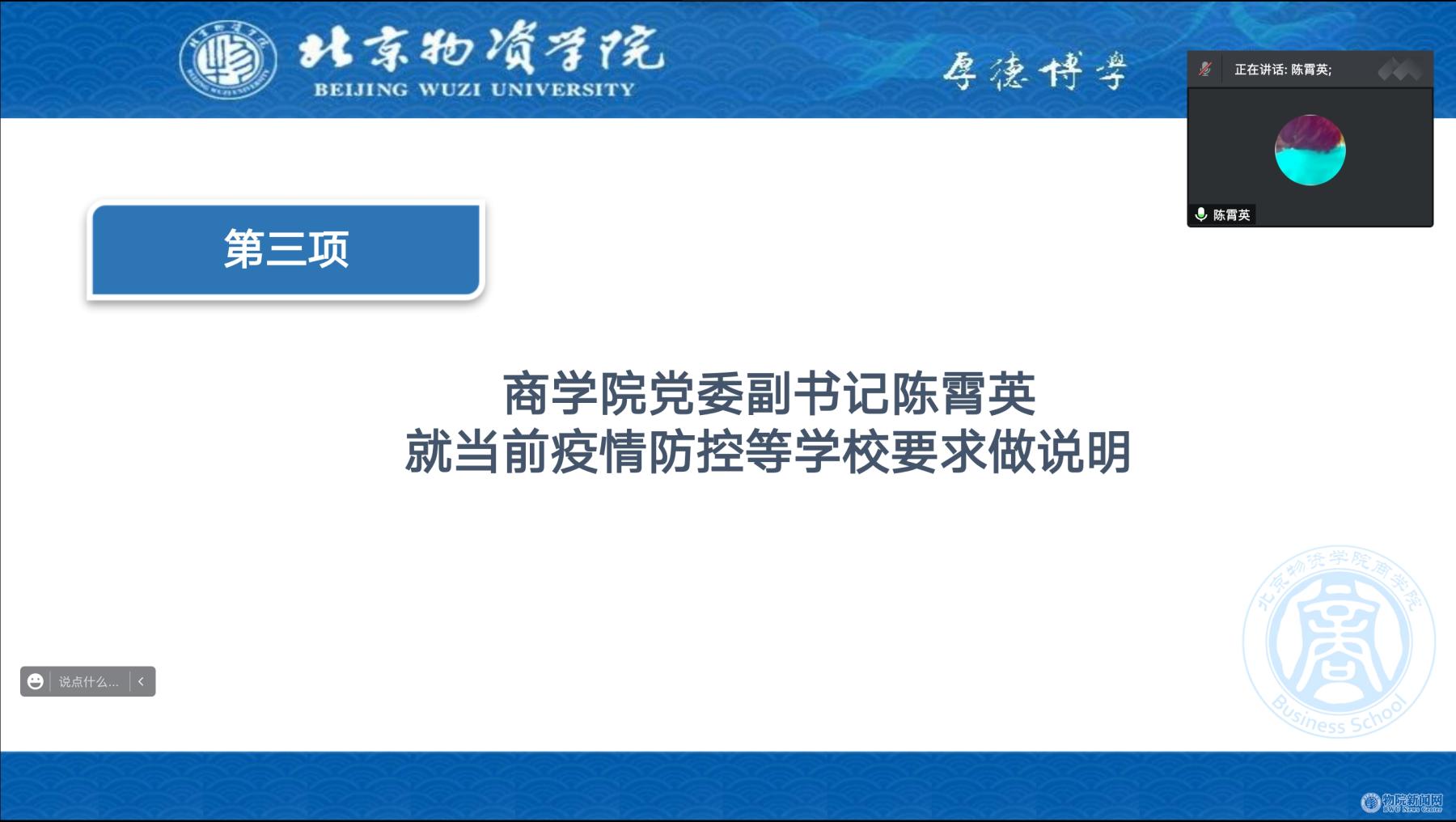 最后,党委副书记陈霄英首先代表学院党委向2022届毕业生送上“云”端问候,并就当前学校疫情防控要求和同学们关心关注的问题做具体说明。陈老师从“疫情防控、人人有责”的角度,指出当前疫情防控的严峻态势,叮嘱同学们实习实践期间注意防护,确保自身安全,并尽快接种疫苗;从“展望未来、时不我待”的角度强调目前距离毕业只剩下两个月的时间,希望同学们能够珍惜应届生身份,争取在毕业前将工作落实,并承诺学院将一如既往的为各位毕业生的毕业、就业等重要事宜保驾护航,全方位给予毕业生就业指导,多角度做好就业促进保障。